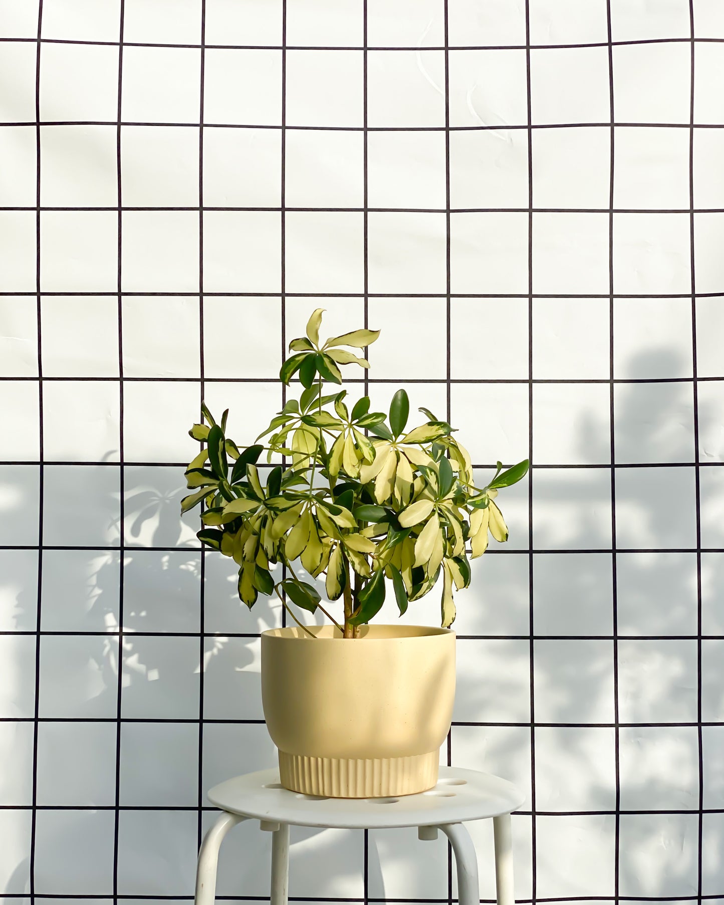 Dwarf Umbrella Tree Variegata styled with Yellow Luna Planter